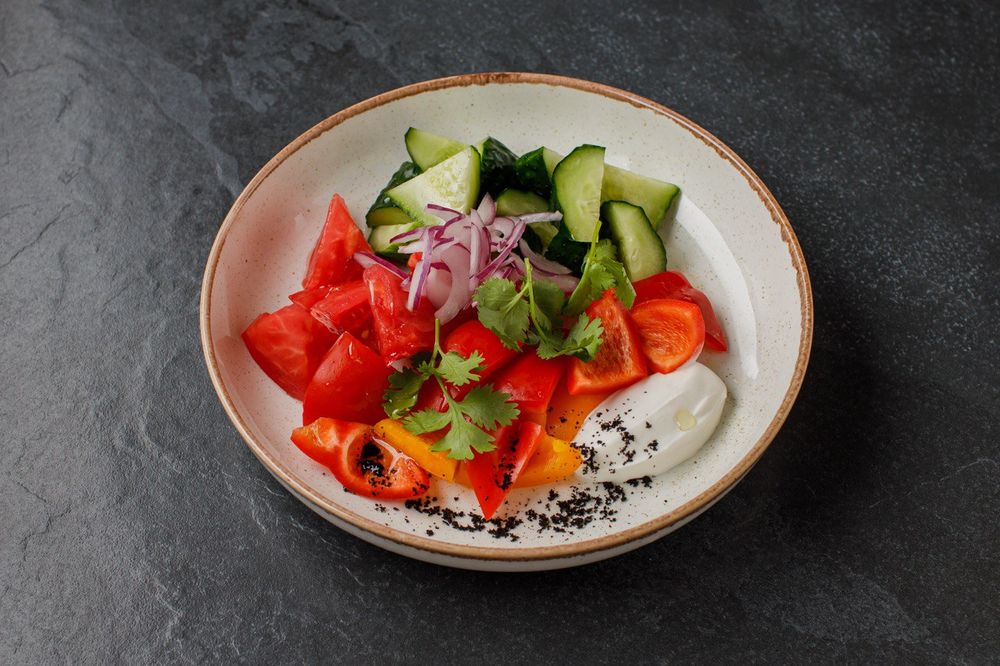 Салат из свежих овощей, огурец, помидор, перец болгарский, ялтинский лук, чеснок, зелень, заправка на выбор: сметана, оливковое масло, соевый соус