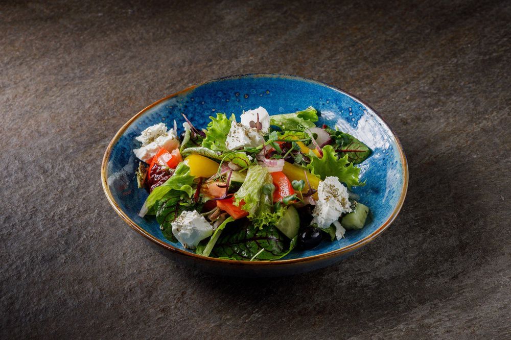 Помидор, огурец, болгарский перец, лук ялтинский, микс салата, маслины, сыр фета, оливковое масло, соевый соус, лимонный фреш, орегано