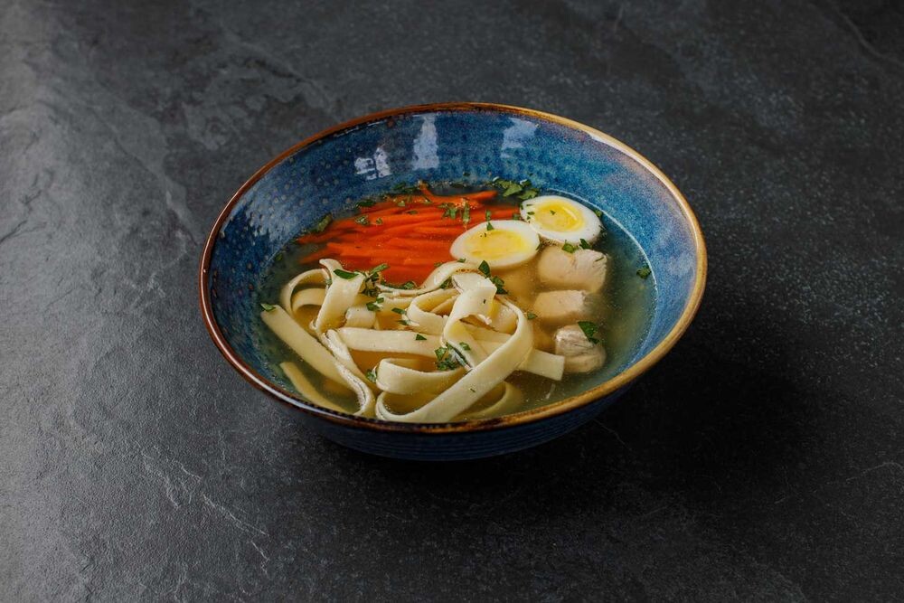 Бульон из цыпленка, паста птитим, морковь, перепелиное яйцо, лук порей