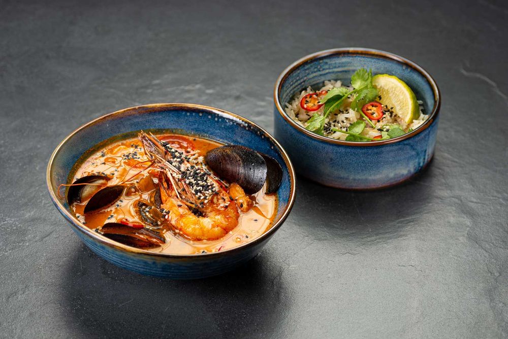 Лангустин, мидии, мидии в створках, кальмары, грибы шиитаке, черри, лайм, кинза, кокосовый лук, рис басмати