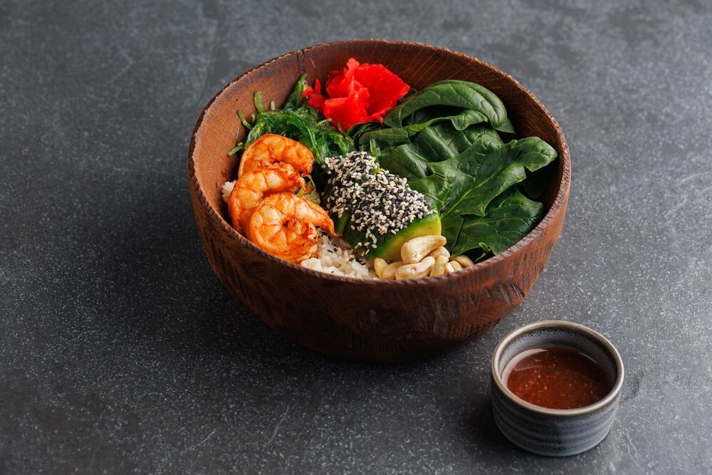 Обжаренные тигровые креветки в маринаде, кокосовый рис, авокадо, маринованый имбирь, салат чука, шпинат, бобы эдамаме, орехи кешью, соус чили-скрембл (растительное масло, соус ким-чи, соус устричный, чеснок, тимьян)