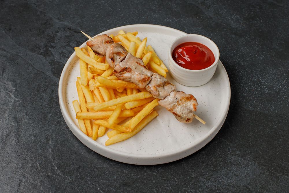 Шашлычок из индейки с гарниром на выбор: отварной рис, картофельное пюре, картофель фри