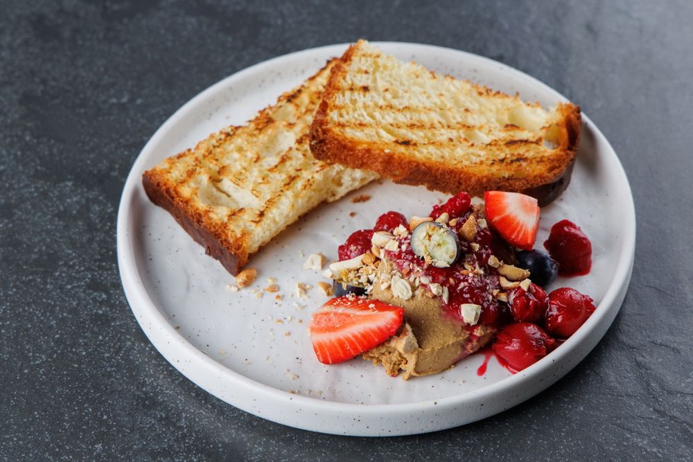 Паштет из куриной печени, тосты из цельнозернового хлеба, орехи кешью и грецкие, вишневый “конфи”