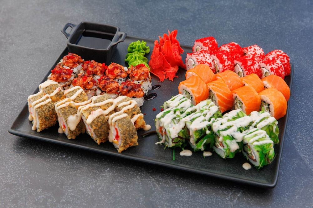 Филадельфия с лососем, калифорния с креветками, ролл Кейсо с лососем, темпура чиз-ролл с креветками, запеченный ролл с тунцом, васаби, имбирь, соевый соус
