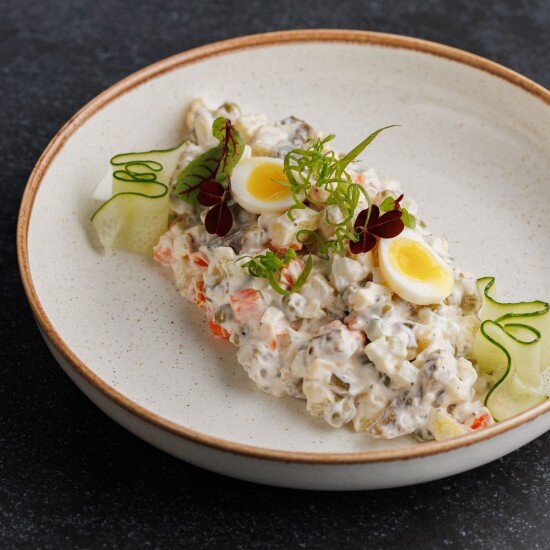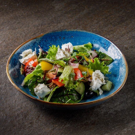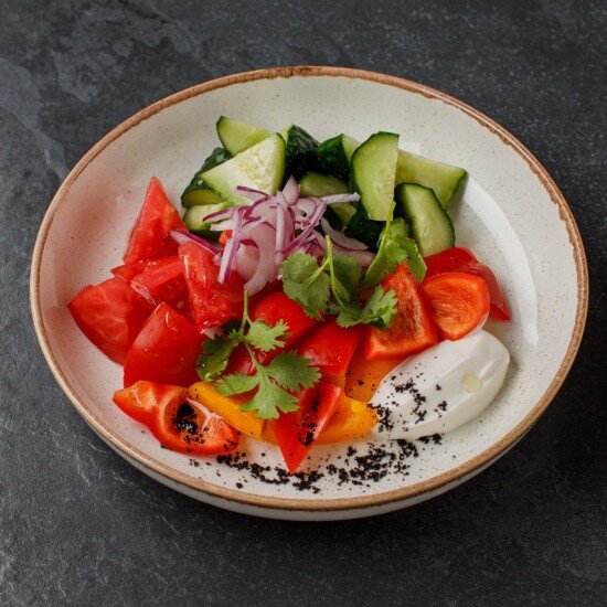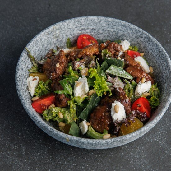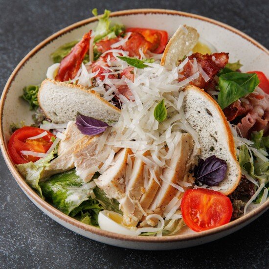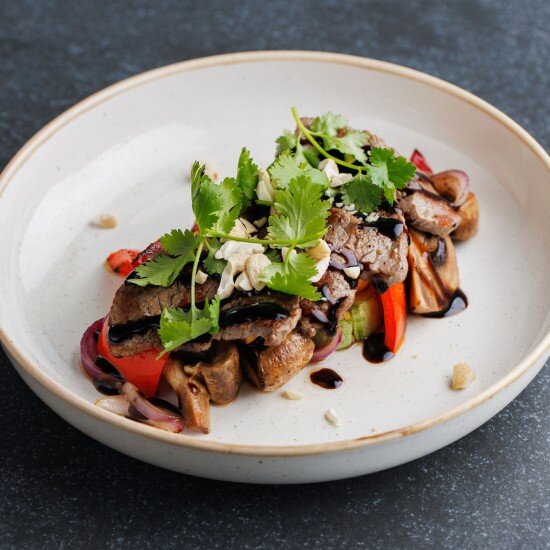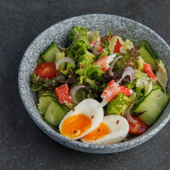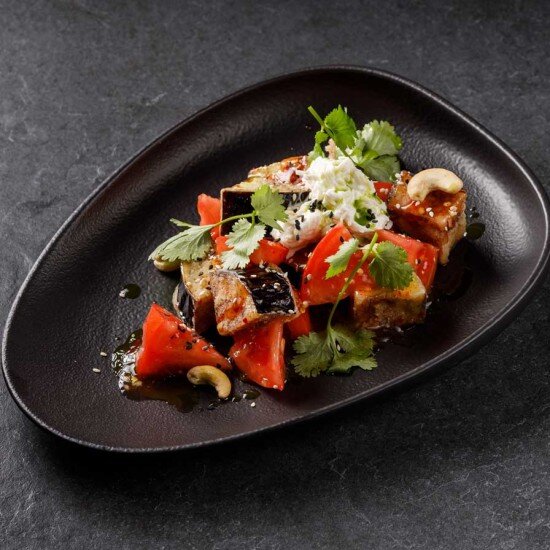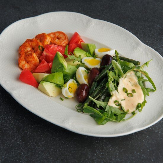 Тигровые креветки, авокадо, помидоры черри, кедровые орешки, соус песто
