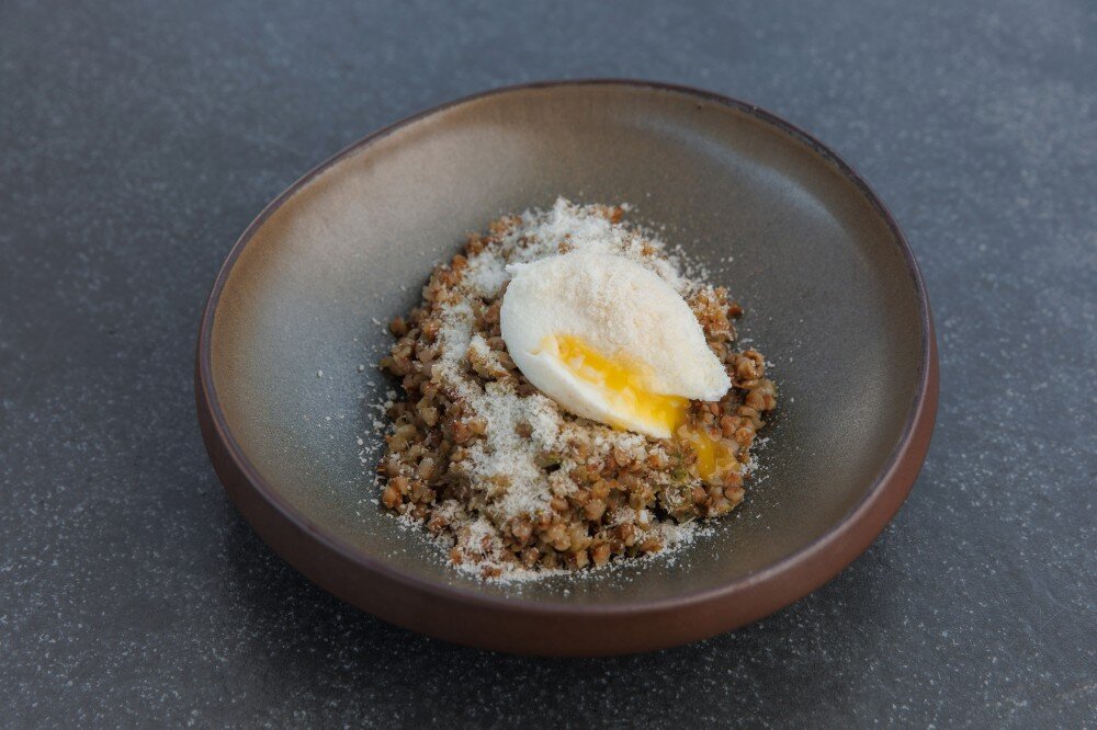 Гречневая каша с соусом ,,песто,,и яйцом пашот