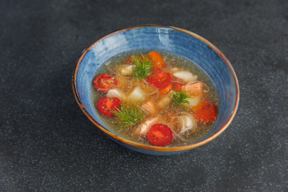 Форель, судак, дорада, картофель, лук порей, перец болгарский, черри, белое вино, зелень
