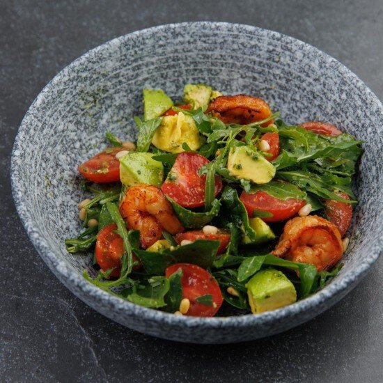 Помидоры черри, апельсин, руккола, айсберг, ромен, медово-горчичная заправка, орехи кешью