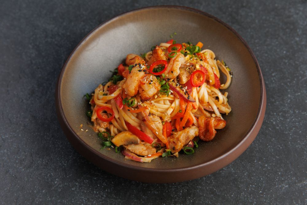 {Сливочный удон с креветками и курицей} с доставкой в Симферополе