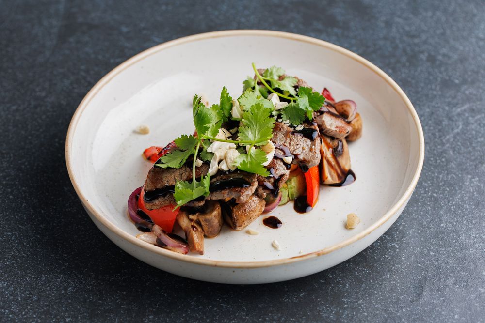 Говяжья вырезка, болгарский перец, вяленые томаты, шампиньоны, кабачок, кешью, ялтинский лук, чеснок, имбирь, соевый соус, бальзамический уксус