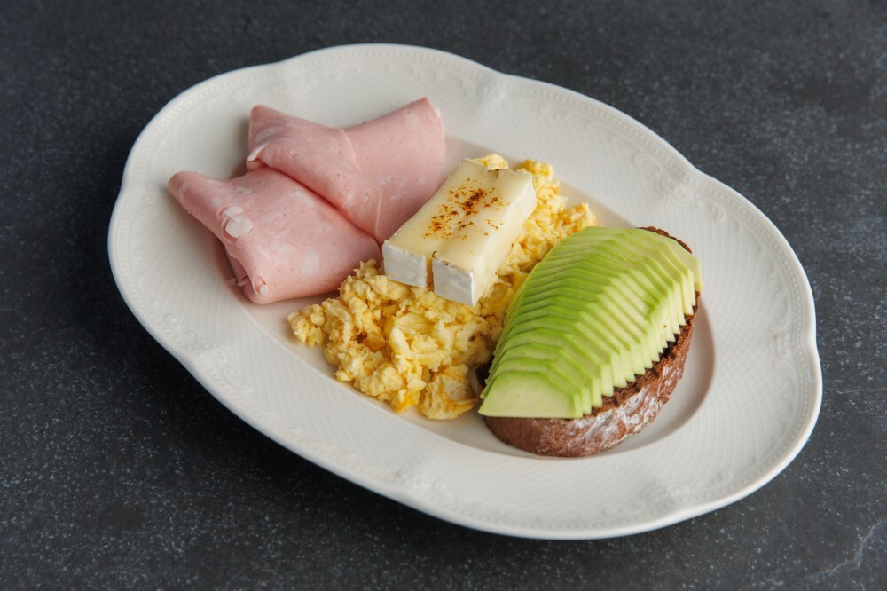 {Скрембл из яйиц с тостом из темного хлеба и мортаделлой} с доставкой в Симферополе