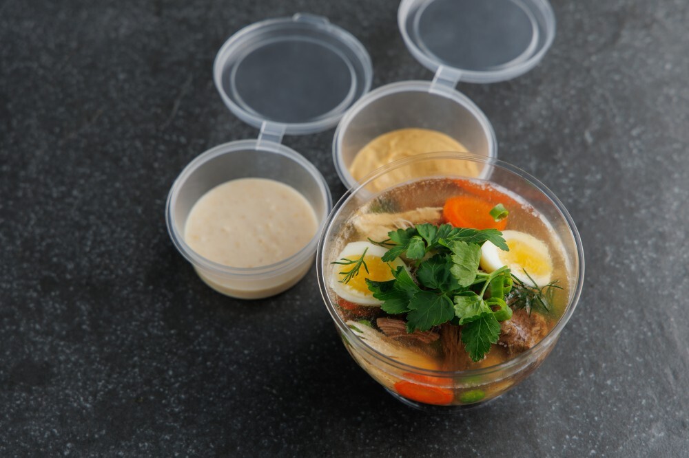говядина, свинина, курица, перепелиное яйцо, морковь, зеленый горошек, зелень