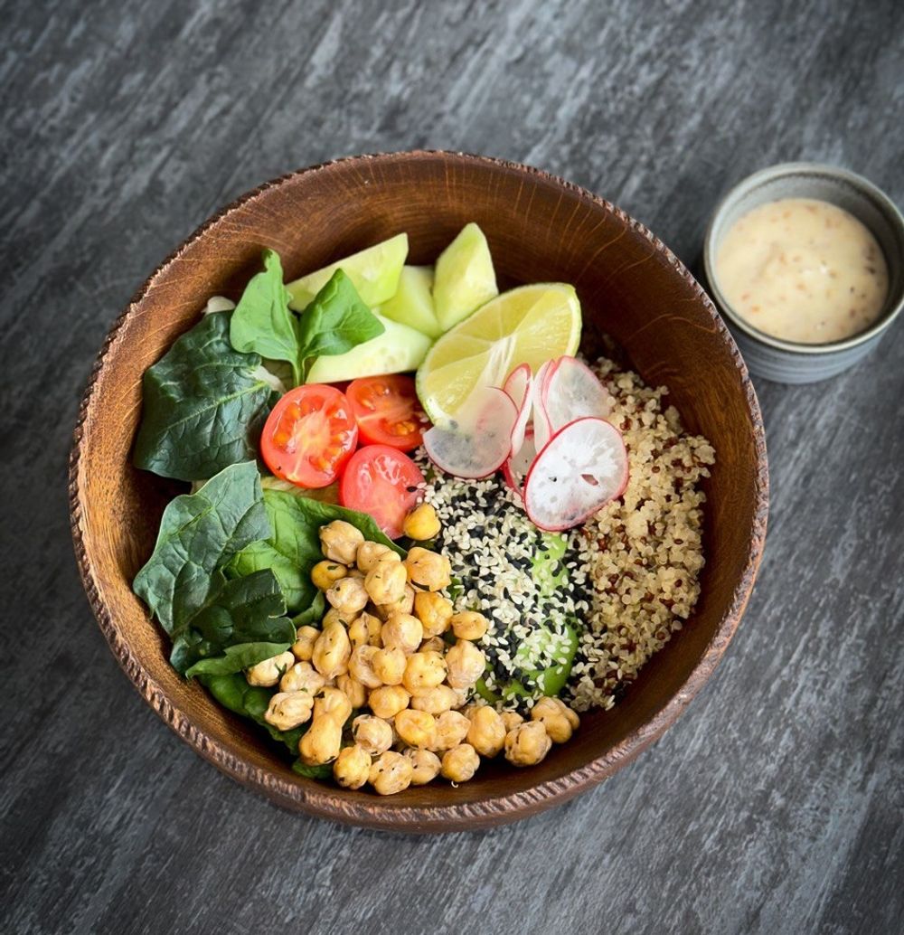 Авокадо, киноа, свежие огурцы, черри, редис, шпинат, айсберг, ореховый соус