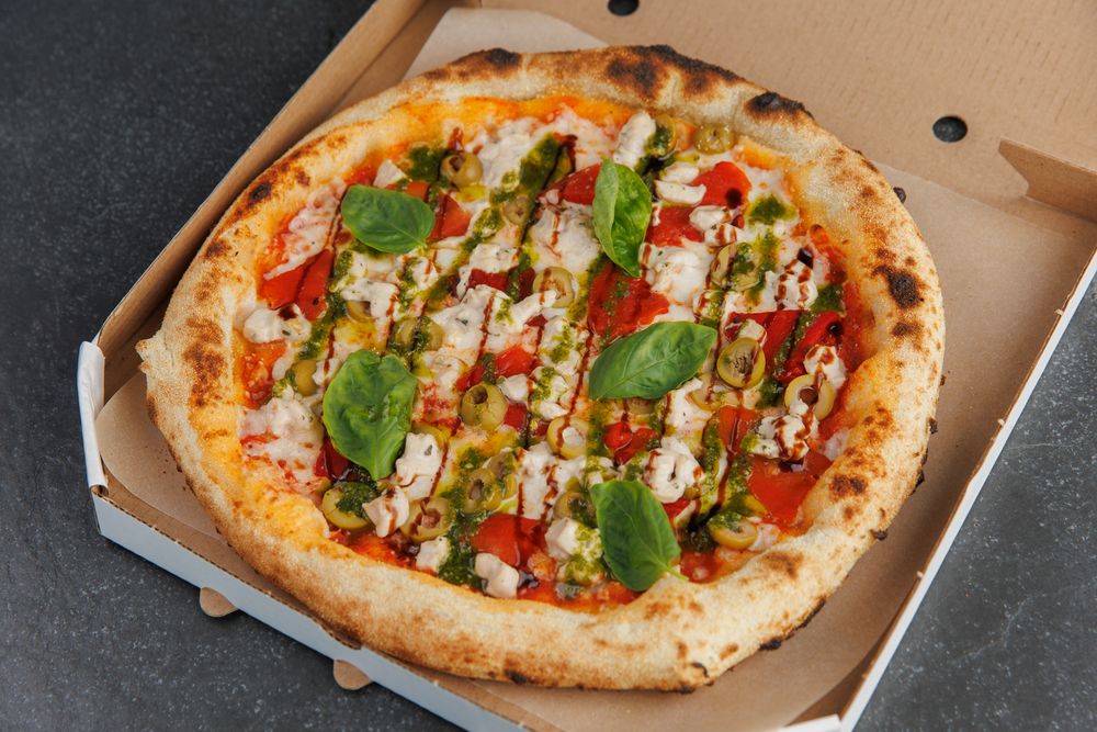 томатный соус, сыр моцарелла, маринованное филе цыпленка, запеченные болгарские перцы, соус песто, оливки, бальзамический крем