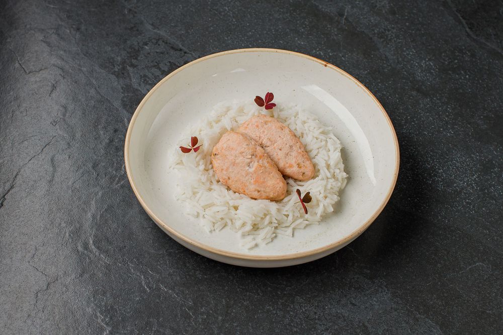 Котлетки из лосося на пару с гарниром на выбор: отварной рис, картофельное пюре, картофель фри
