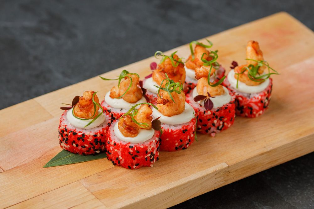 Ролл с креветками в темпуре с зеленым луком